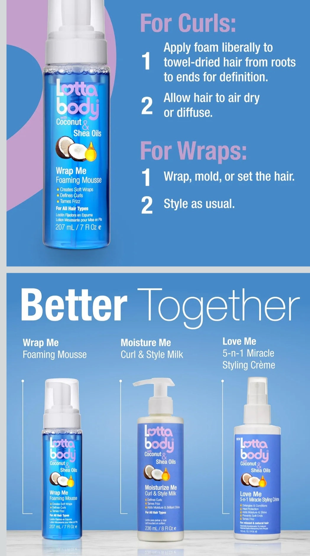 Perfeziona lo styling dei tuoi capelli con Lottabody Wrap Me Foaming Mousse. Arricchita con le proprietà nutrienti degli Oli di Cocco e Karité, questa formula professionale offre una tenuta eccezionale mantenendo i capelli morbidi e idratati. Ideale per definire i ricci, realizzare pieghe lisce o eliminare l'effetto crespo per un risultato luminoso e senza residui.